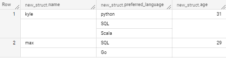 #case 1 Struct구조 데이터셋 생성 WITH array_in_struct AS ( # RECORD/NULLABLE SELECT STRUCT('kyle' as name, ['python','SQL','Scala'] as preferred_language, 31 as age) AS new_struct UNION ALL SELECT STRUCT('max', ['SQL','Go'], 29) ), struct_in_array AS ( # RECORD/REPEATED SELECT ARRAY( SELECT AS STRUCT 'kyle' as name, ['python','SQL','Scala'] as preferred_language, 31 as age UNION ALL SELECT AS STRUCT 'ma..